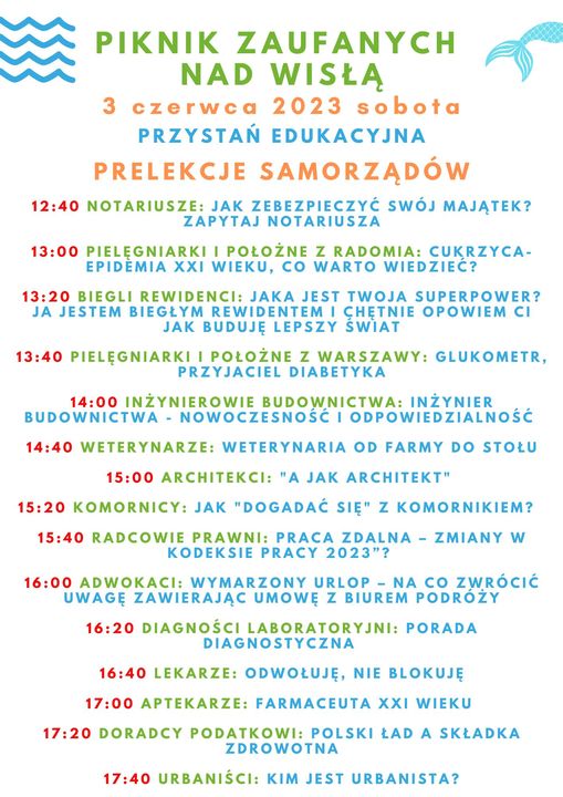 W sobotę 3 czerwca w godzinach 11:00-22:00 na Bulwarach Wiślanych odbędzie się „Piknik Zaufanych nad Wisłą”. Organizatorem wydarzenia jest Mazowieckie Forum Zawodów Zaufania Publicznego, którego członkiem jest od wielu lat Regionalny Oddział Polskiej Izby Biegłych Rewidentów w Warszawie. Zapraszamy serdecznie do udziału w pikniku, podczas którego wiele atrakcji znajdą dla siebie zarówno dorośli, jak i dzieci.