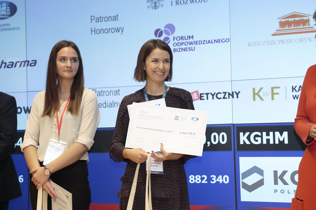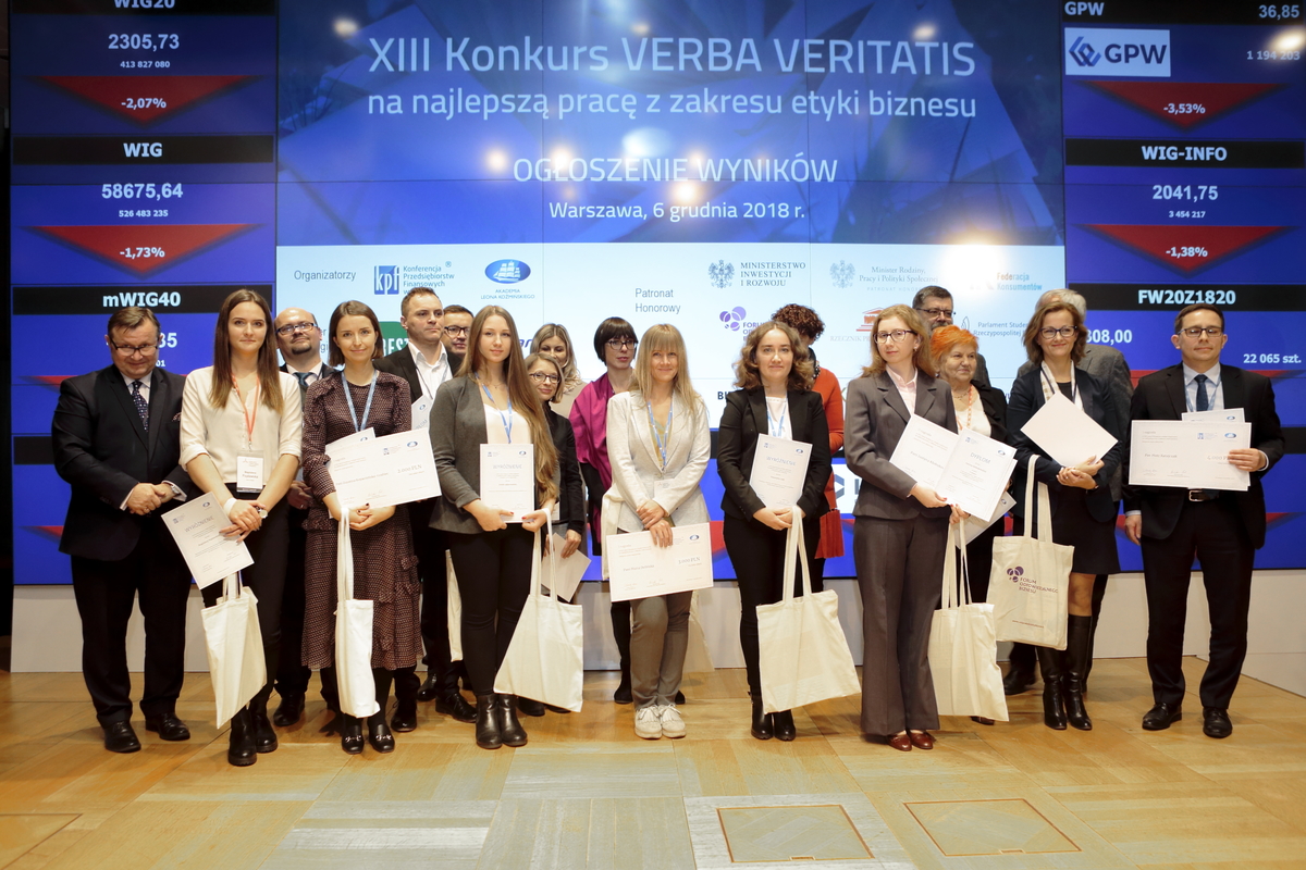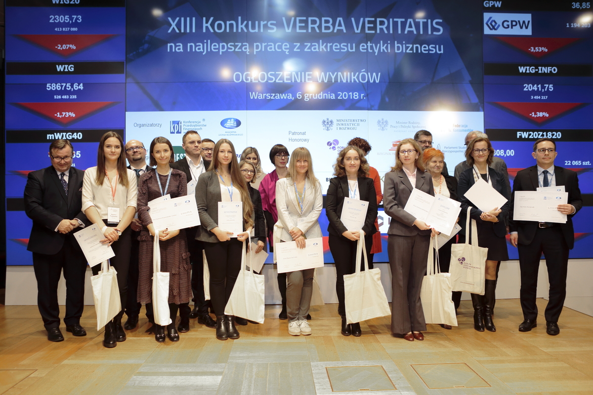 Konkurs Verba Veritatis to wspólna inicjatywa Konferencji Przedsiębiorstw Finansowych w Polsce i Akademii Leona Koźmińskiego. Do trzynastu zrealizowanych już edycji konkursu zgłoszono łącznie 308 prac konkursowych z 59 polskich uczelni. Dziesięcioro laureatów wybrano w kategoriach prace doktorskie, magisterskie oraz „pozostałe” (konkurowały tu przede wszystkim prace licencjackie i MBA). W kapitule konkursu Polską Izbę Biegłych Rewidentów reprezentowała Ewa Sowińska, zastępca prezesa KRBR. Za najlepszą pracę doktorską uznano dysertację dr. Piotra Ratajczaka (Uniwersytet Ekonomiczny w Poznaniu), poświęconą tworzeniu wartości firm przez działalność CSR. Nagrodzona praca magisterska, autorstwa Marii Dolińskiej (Akademia Leona Koźmińskiego w Warszawie), traktowała zaś o tym, jak pokolenie millenialsów postrzega korporacyjne raporty zrównoważonego rozwoju.