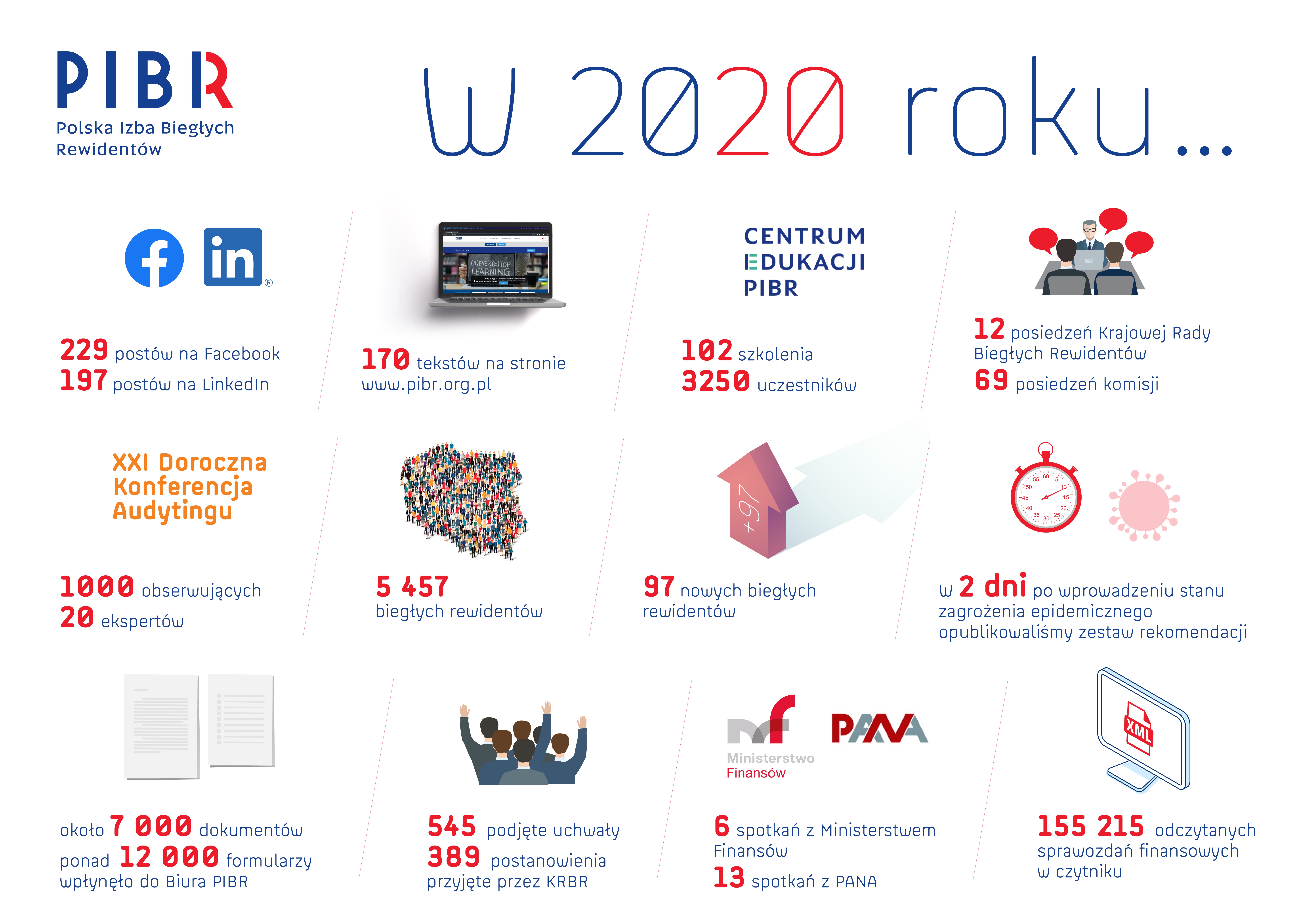 Prezes KRBR w swoim podsumowaniu zwraca uwagę na ilość zadań, które w pandemicznym roku 2020 wypełniał samorząd biegłych rewidentów. Najważniejsze aktywności Izby były systematycznie przedstawiane w kolejnych kwartalnych podsumowaniach. W sposób bardziej syntetyczny skalę działań podejmowanych przez KRBR i biuro PIBR można zobaczyć na infografice: