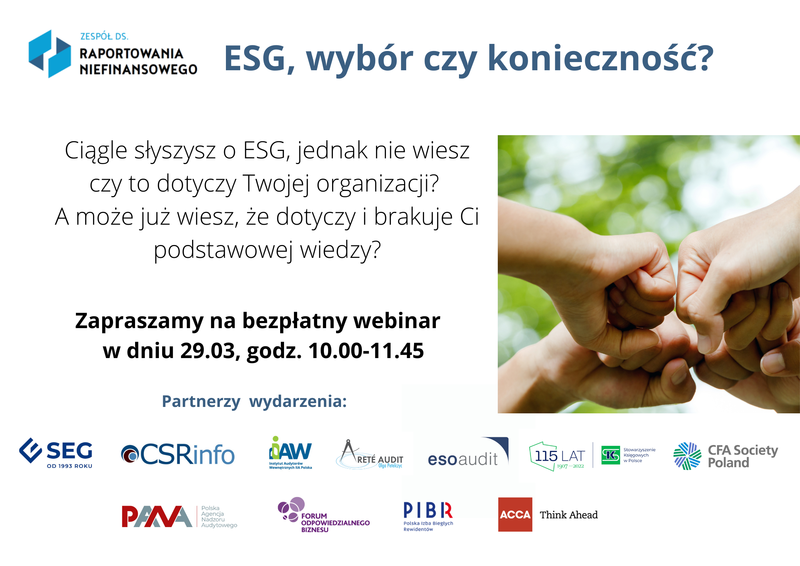 Polska Izba Biegłych Rewidentów zaprasza na webinar „ESG, wybór czy konieczność?”, będący wspólną inicjatywą członków Zespołu ds. raportowania niefinansowego.