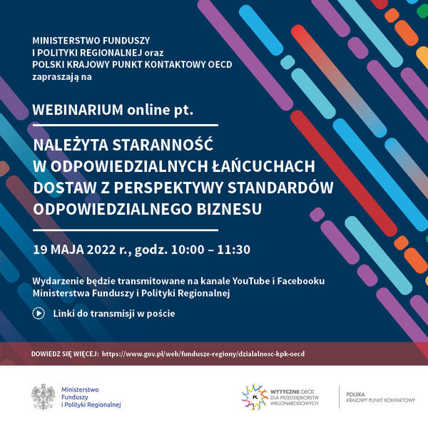 Ministerstwo Funduszy i Polityki Regionalnej oraz Krajowy Punkt Kontaktowy OECD ds. odpowiedzialnego biznesu zapraszają na webinarium „Należyta staranność w odpowiedzialnych łańcuchach dostaw z perspektywy standardów odpowiedzialnego biznesu”. Odbędzie się ono już w najbliższy czwartek, 19 maja, w godz. 10.00-11.30.