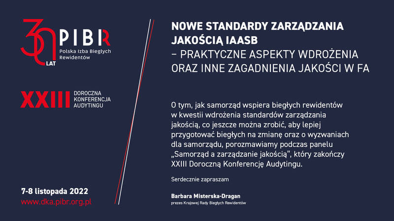 Rola samorządu zawodowego w kwestii wdrożenia standardów zarządzania jakością będzie tematem panelu samorządowego, który zakończy XXIII edycję Dorocznej Konferencji Audytingu.