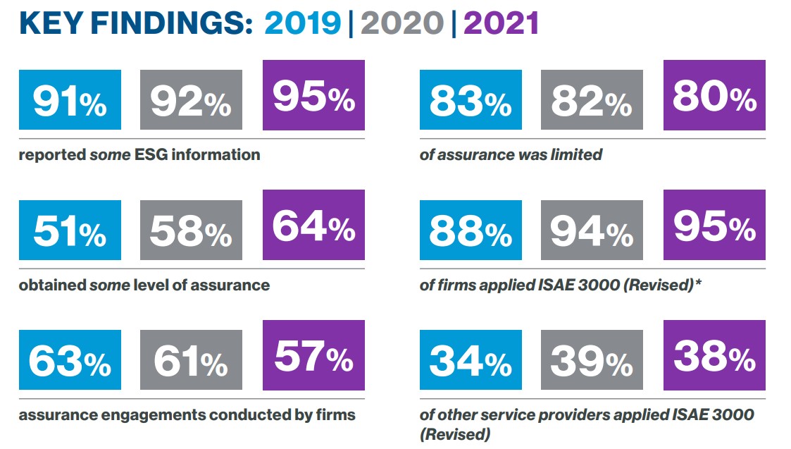 Według badania przeprowadzonego przez IFAC oraz AICPA & CIMA, około 95% dużych firm ujawniło informacje dotyczące ESG w 2021 r. (najświeższym dostępnym okresie, który mógł być poddany analizie). W 2019 r. ten odsetek wyniósł 91%. W 2021 r. 64% spółek uzyskało atestację przynajmniej niektórych z ujawnianych informacji ESG, co oznacza wzrost w porównaniu z wynikiem odnotowanym w 2019 r. (51%). Jednak dotychczasowa niezdolność do przyjęcia jednolitych, globalnie uznawanych standardów nadal stwarza wyzwania.
