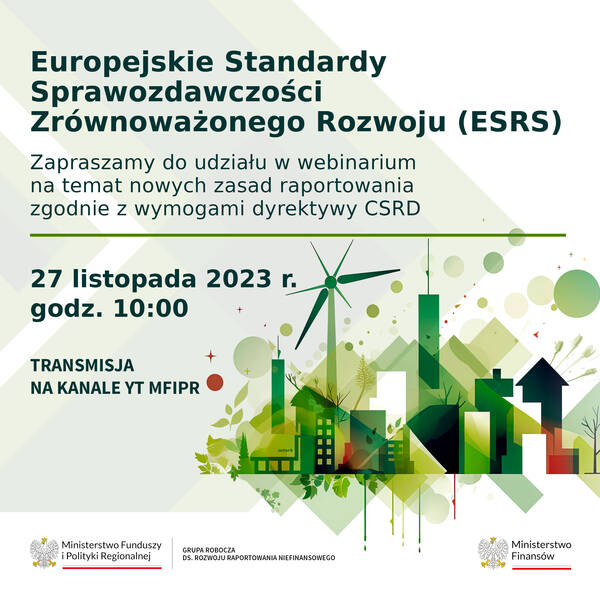 Wszystkich zainteresowanych pogłębieniem wiedzy na temat Europejskich Standardów Sprawozdawczości Zrównoważonego Rozwoju (ESRS) zachęcamy do obejrzenia nagrania webinarium, które zorganizowało Ministerstwo Finansów oraz Ministerstwo Funduszy i Polityki Regionalnej 27 listopada 2023 r.