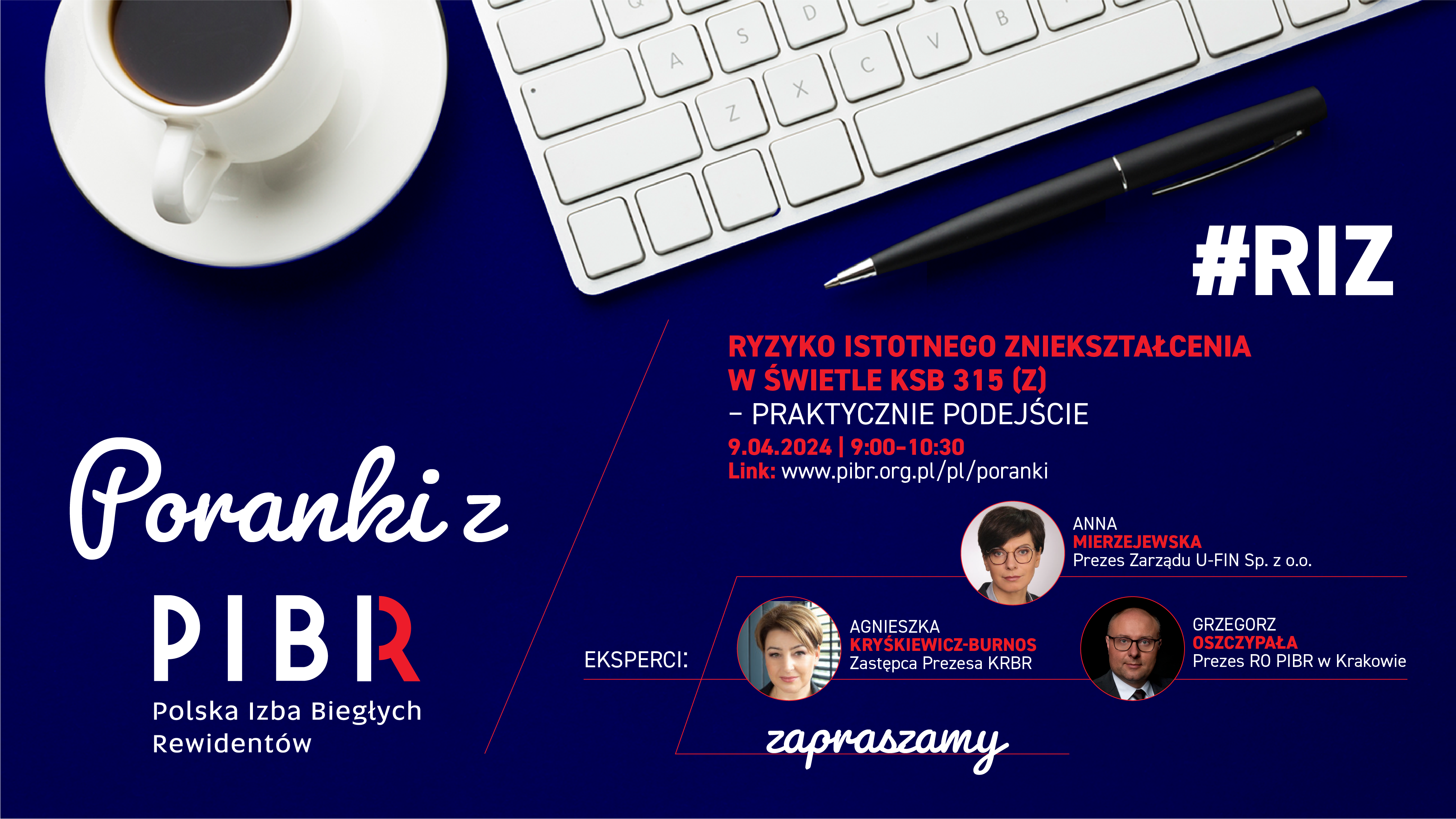 „Ryzyko istotnego zniekształcenia w świetle KSB 315 (Z)” będzie tematem 5. spotkania z cyklu „Poranki z PIBR”, które odbędzie się 9 kwietnia w godz. 9.00 – 10.30. Naszymi gośćmi będą: Agnieszka Kryśkiewicz-Burnos, Zastępca Prezesa KRBR, Anna Mierzejewska, biegły rewident, Prezes Zarządu U-FIN Sp. z o.o. oraz Grzegorz Oszczypała, Prezes RO PIBR w Krakowie.