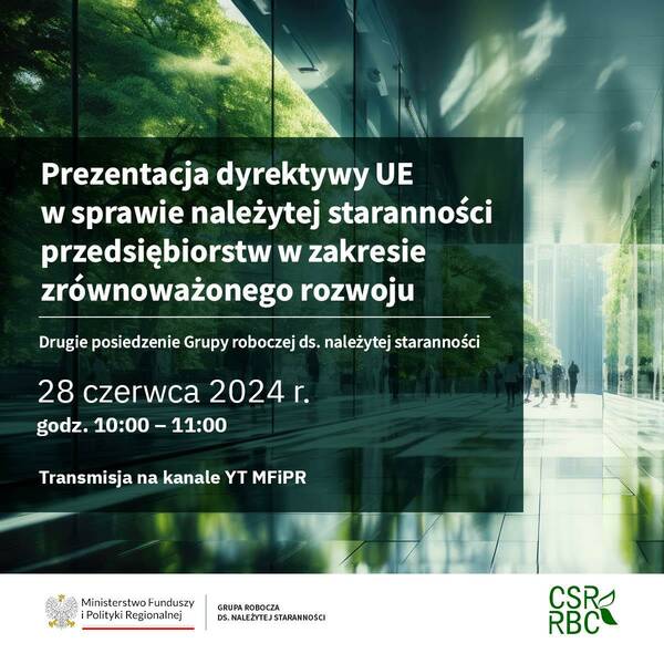Ministerstwo Funduszy i Polityki Regionalnej zaprasza do obejrzenia 28 czerwca 2024 r. prezentacji dyrektywy UE w sprawie należytej staranności przedsiębiorstw w zakresie zrównoważonego rozwoju (Corporate Sustainability Due Diligence Directive - CSDDD).