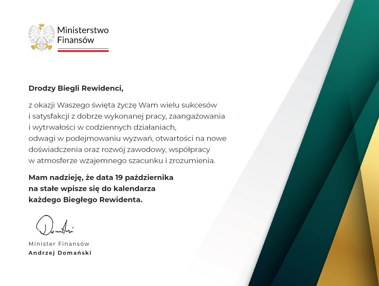 Z okazji Dnia Biegłego Rewidenta Minister Finansów Andrzej Domański przekazał nam życzenia. Serdecznie dziękujemy za pamięć i docenienie!