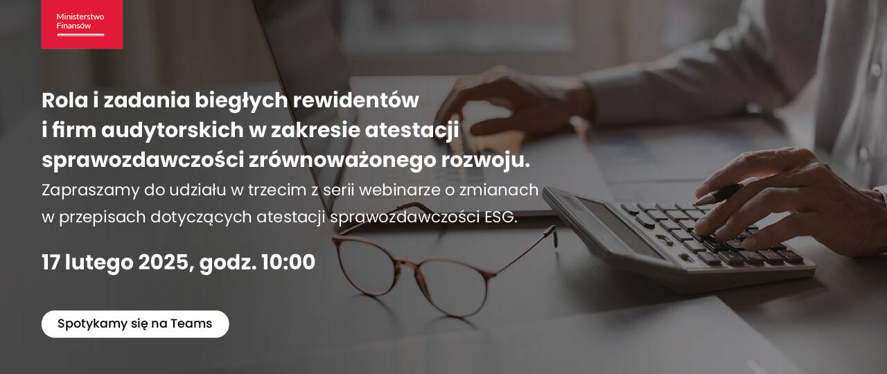 Podczas organizowanego przez Ministerstwo Finansów webinaru, eksperci z resortu finansów, Polskiej Agencji Nadzoru Audytowego oraz Polskiej Izby Biegłych Rewidentów opowiedzą o najważniejszych zmianach w przepisach ustawy o biegłych rewidentach w zakresie atestacji sprawozdawczości zrównoważonego rozwoju, o krajowym standardzie usług atestacji sprawozdawczości zrównoważonego rozwoju (KSUA 3002PL), o pracach nad standardem atestacji sprawozdawczości zrównoważonego rozwoju, który ma przyjąć Komisja Europejska oraz o zmianach wynikających dla samorządu i biegłych rewidentów (obowiązkowe doskonalenie zawodowe, rejestr biegłych rewidentów).