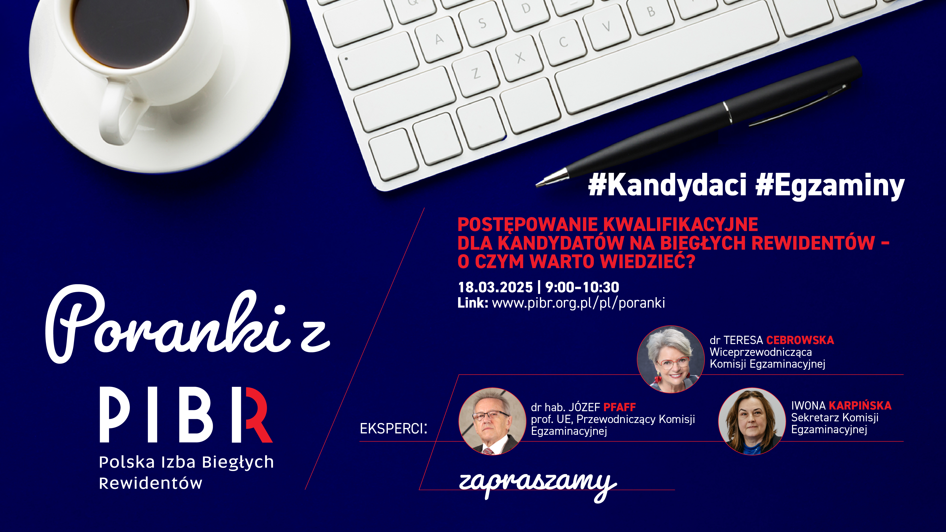 Kolejny „Poranek z PIBR” odbędzie się we wtorek 18 marca w godz. 9:00 -10:30 i będzie poświęcony omówieniu najważniejszych zagadnień związanych z procesem postępowania kwalifikacyjnego na biegłych rewidentów. Zapraszamy wszystkich zainteresowanych zawodem na spotkanie z przedstawicielami Komisji Egzaminacyjnej.
