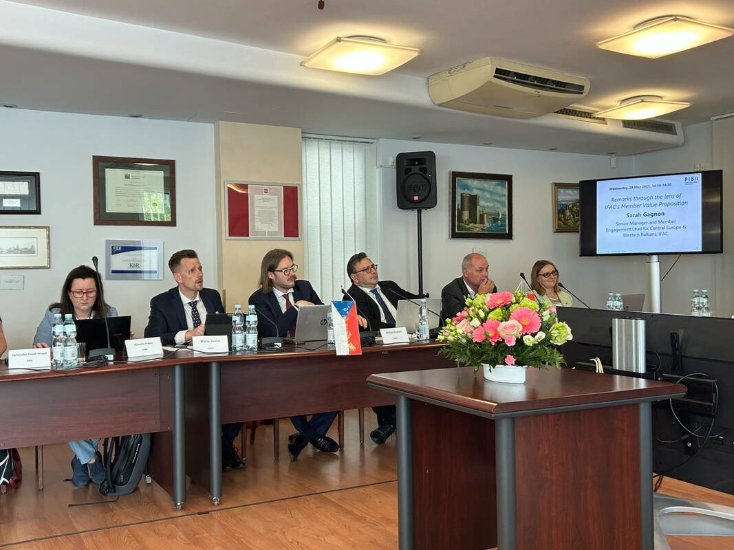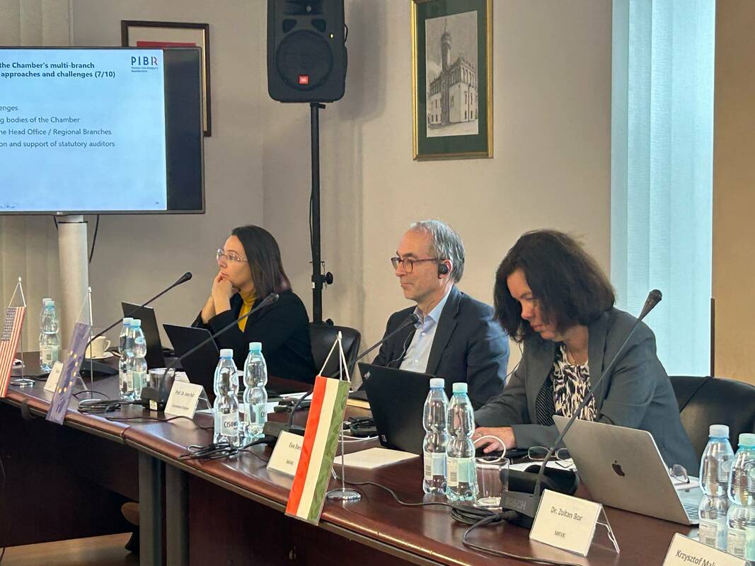 Po wystąpieniach gości z międzynarodowych organizacji rozpoczęła się sesja na temat współpracy z krajowymi organami nadzoru publicznego oraz doświadczeń w zakresie kontroli jakości. W Czechach, na Słowacji i na Węgrzech nadzór nad wykonywaniem badań jest podzielony pomiędzy izbę (badania nie-JZP) a organ nadzoru (badania JZP). Rozmawiano o przebiegu kontroli w poszczególnych krajach, obszerności przekazywanej dokumentacji, systemie sankcji i skalowalności. W toku dyskusji okazało się, że tylko w Polsce cała dokumentacja dotycząca systemu musi być prowadzona w języku polskim, w pozostałych krajach V4 możliwy jest język angielski. Nie ma też potrzeby przekazywania organowi całości sprawdzanej dokumentacji badania i to w dodatku przetłumaczonej na język krajowy. Na Słowacji kontrola jest prowadzona w siedzibie firmy, w Czechach najpierw na miejscu, a kontynuowana zdalnie, natomiast na Węgrzech przyjęte są obydwa warianty, w zależności od preferencji firmy. Co ważne, we wszystkich 3 krajach kluczowe spotkania odbywają się w siedzibie firmy. Przedstawiciele izb goszczący w siedzibie PIBR ocenili, że w Polsce zakres potrzebnych organowi do kontroli danych i informacji, język dokumentacji, forma wykonywania kontroli oraz sam system dochodzeń i sankcji jest najmniej przyjazny dla firm i biegłych.