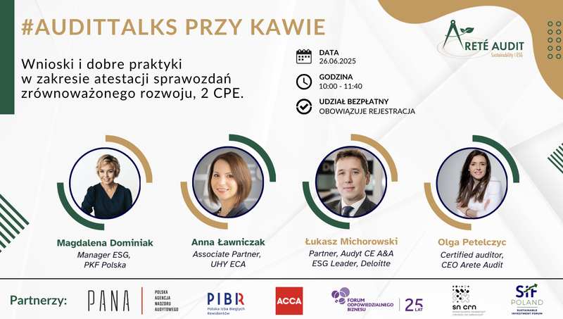 W czwartek 26 czerwca odbędzie się webinar z cyklu #Audittalks przy kawie pt. „Wnioski i dobre praktyki w zakresie atestacji sprawozdań zrównoważonego rozwoju, 2 CPE.” Polska Izba Biegłych Rewidentów jest partnerem tego wydarzenia. Zachęcamy do udziału.