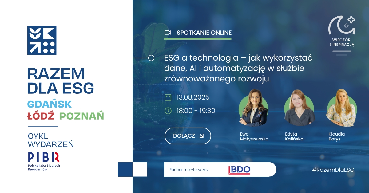 Tematem spotkania, które odbędzie się 13 sierpnia, będzie: „ESG a technologia – jak wykorzystać dane, AI i automatyzację w służbie zrównoważonego rozwoju.” Zachęcamy do udziału w 8. „Wieczorze z Inspiracją”, którego gośćmi będą eksperci firmy BDO.