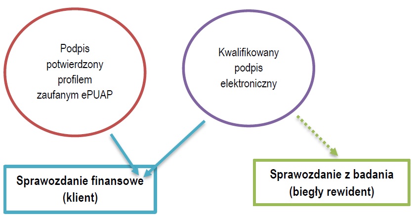 ustawy o biegłych rewidentach, sprawozdanie z badania jednostek podlegających wpisowi do rejestru przedsiębiorców KRS (spółka akcyjna się do nich zalicza) musi być sporządzone w postaci elektronicznej i opatrzone kwalifikowanym podpisem elektronicznym biegłego rewidenta. Ustawa o biegłych rewidentach nie przewiduje możliwości zastosowania podpisu potwierdzonego profilem zaufanym ePUAP w odniesieniu do sprawozdania z badania. Szczegóły dotyczące rodzajów podpisów, jakie mogą być składane na dokumentach w formie elektronicznej przedstawia poniższy schemat: (18.01.2019)